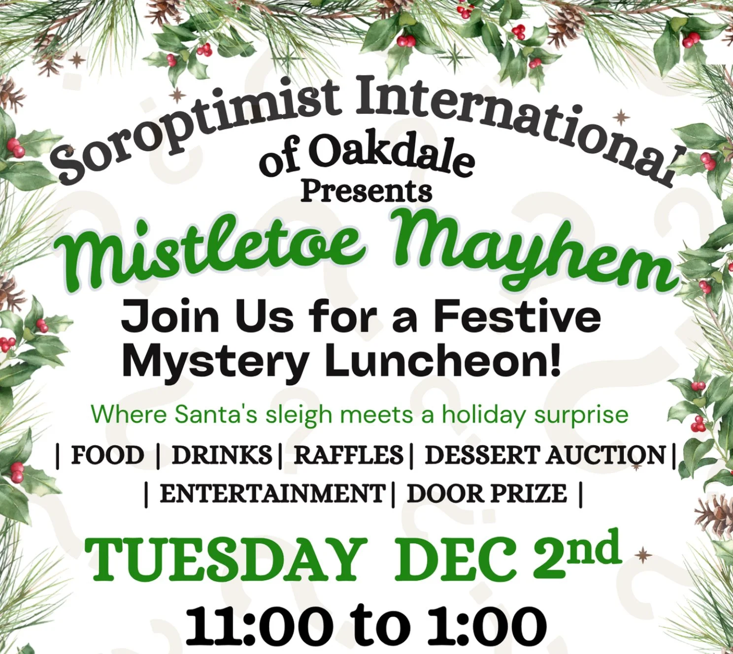 Soroptimist of Oakdale presents - Mistletoe Mayhem holiday luncheon. Join us for a festive mystery luncheon!